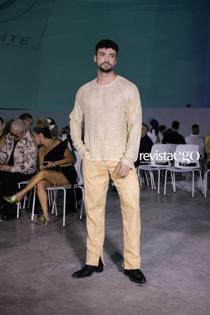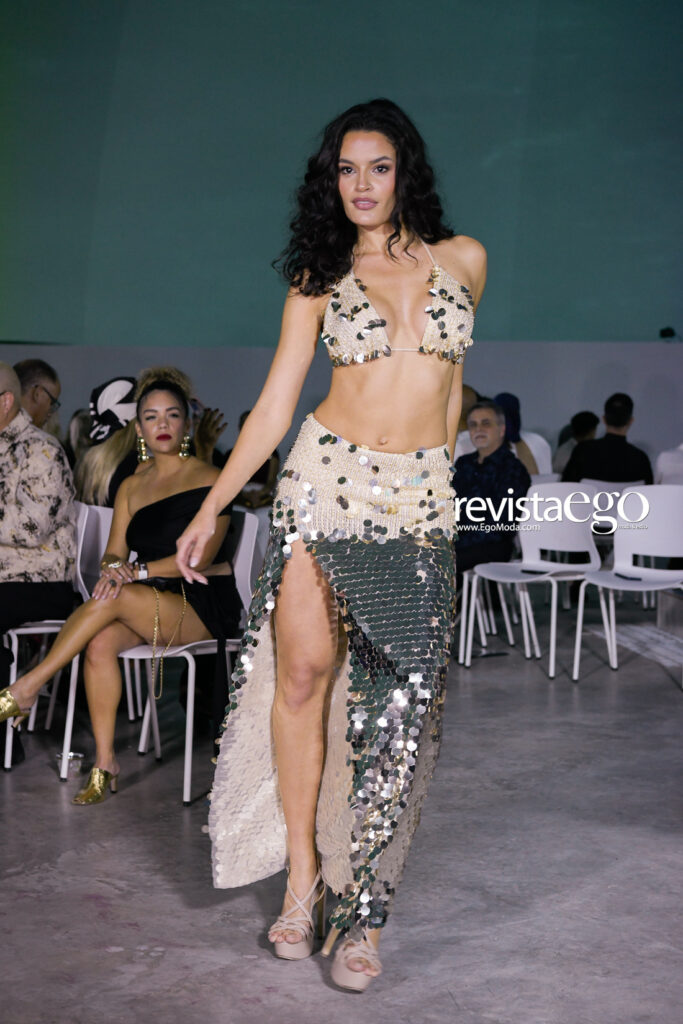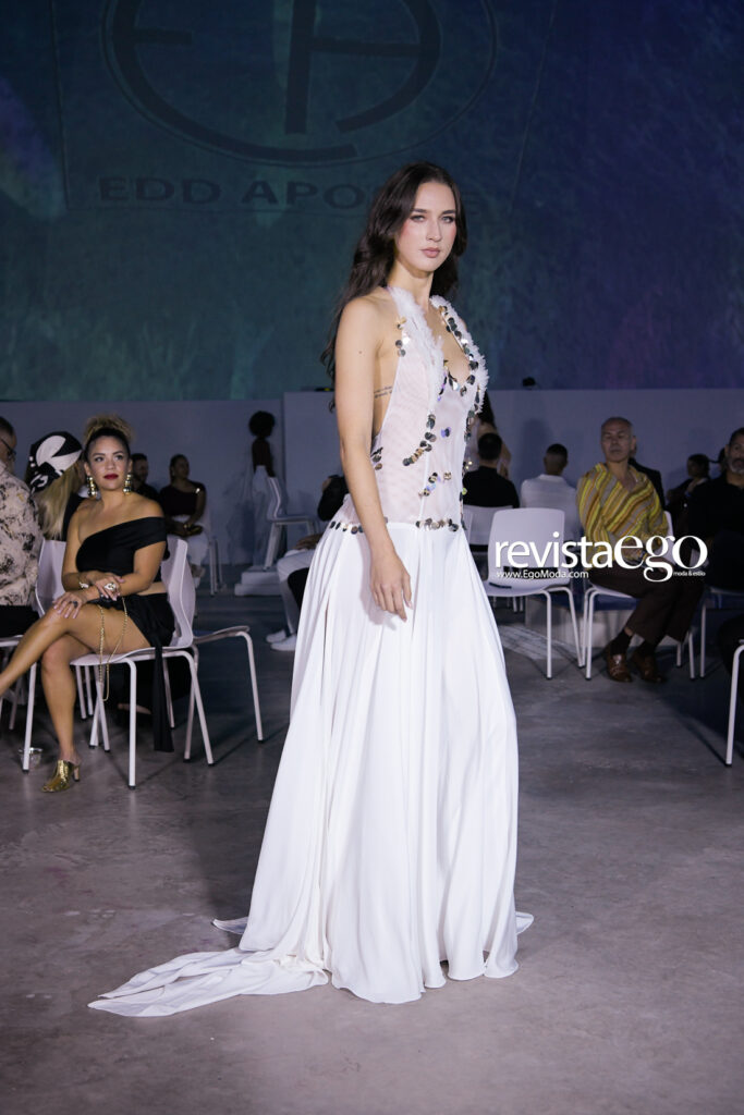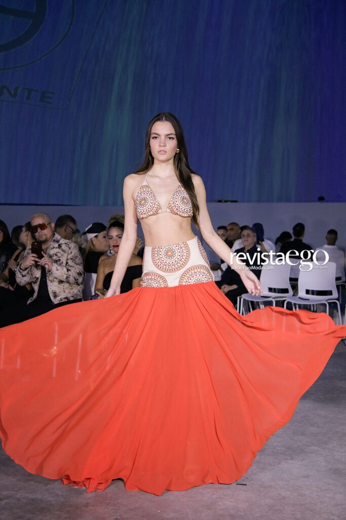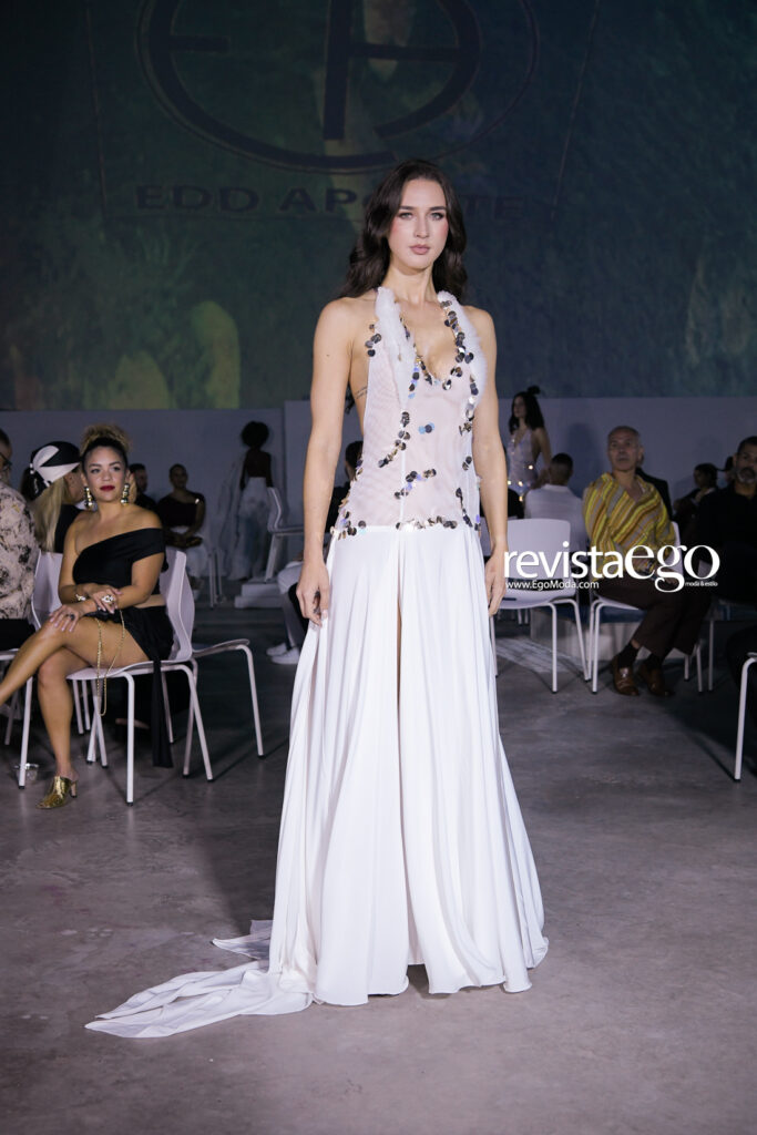 Con una fusión exquisita de algodón, lino y seda, entretejida con destellos de lentejuelas, bordados y cristales, Aponte mostró su maestría en equilibrar lo natural y lo glamuroso. La paleta cromática—blancos puros, beige cálidos, naranjas solares y azules oceánicos—pintó en la pasarela un retrato vivo de la riqueza caribeña.